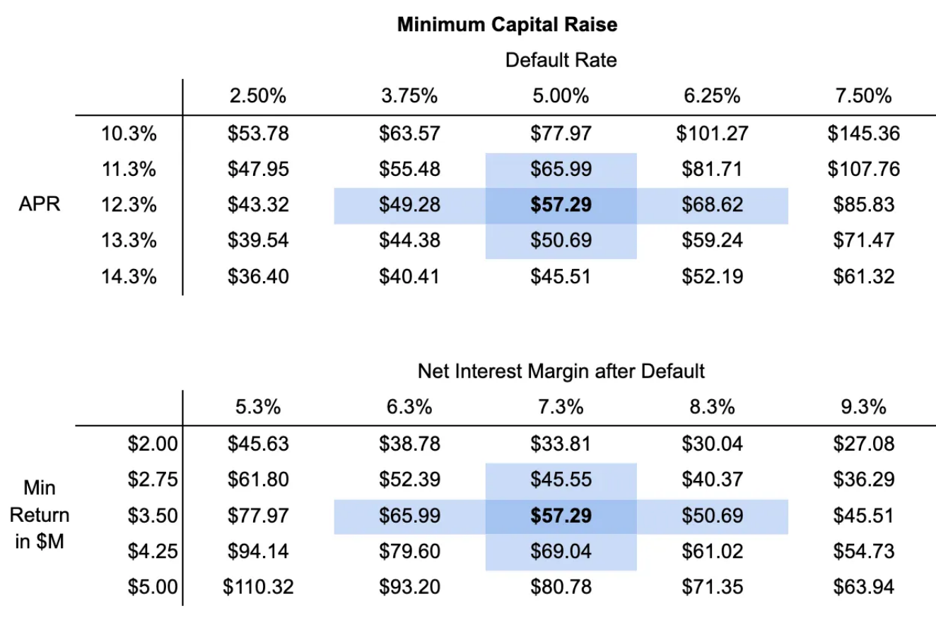 A sensitivity analysis was conducted to determine the target capital raise required to yield $3.5 million in annual income, while also allocating 5% of the initial raise to a token liquidity pool. Based on this analysis, multiple capital raise scenarios were modeled.