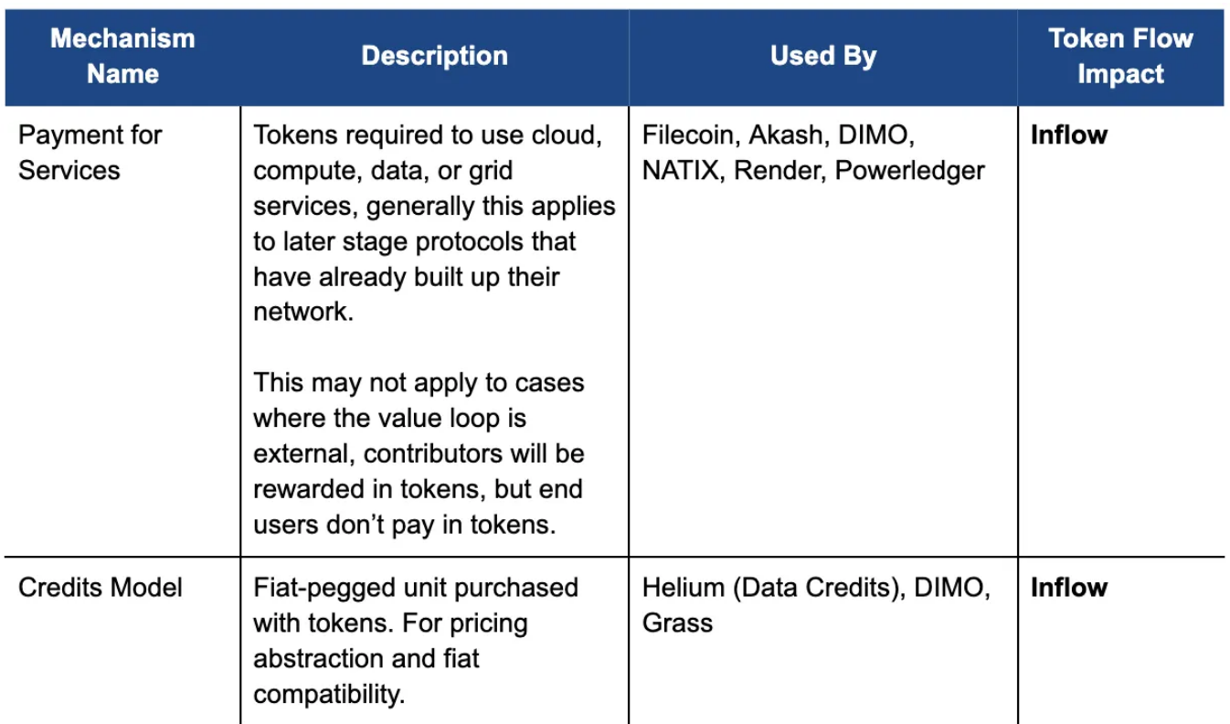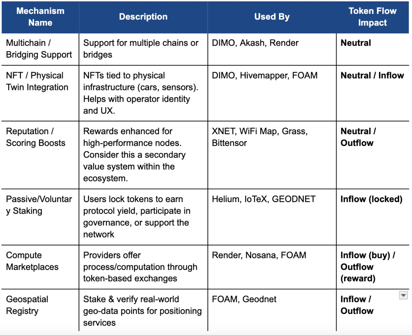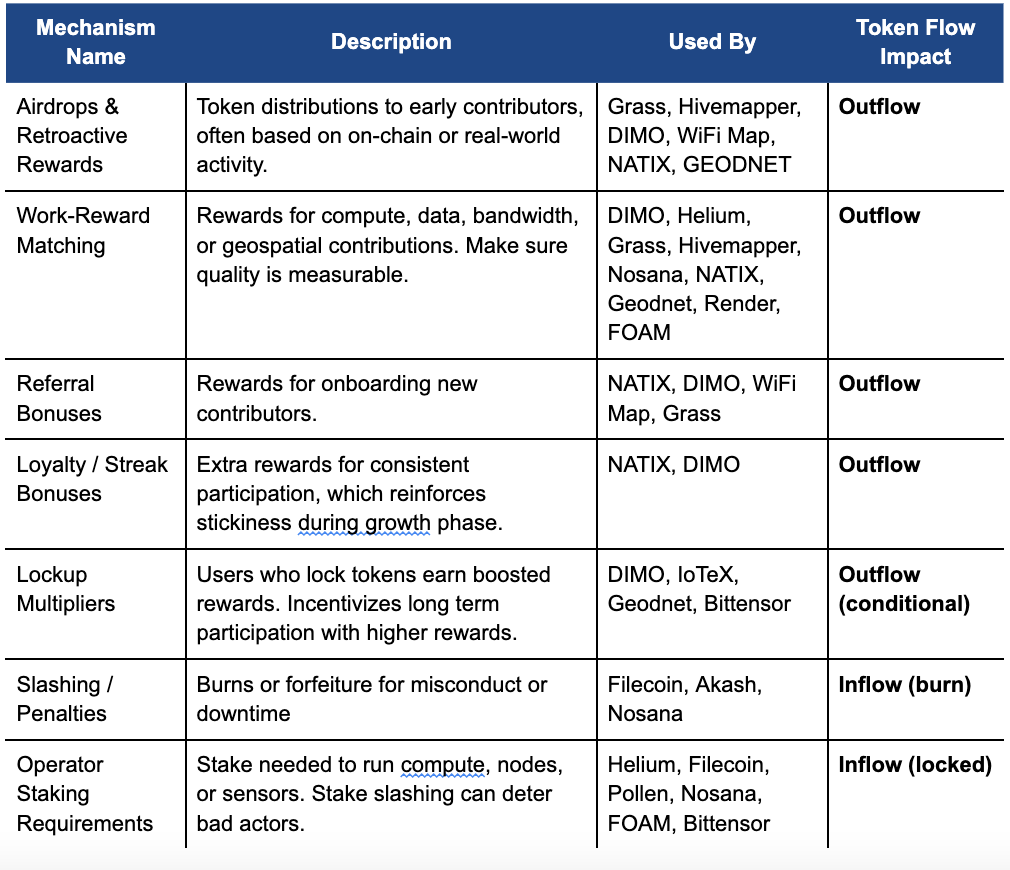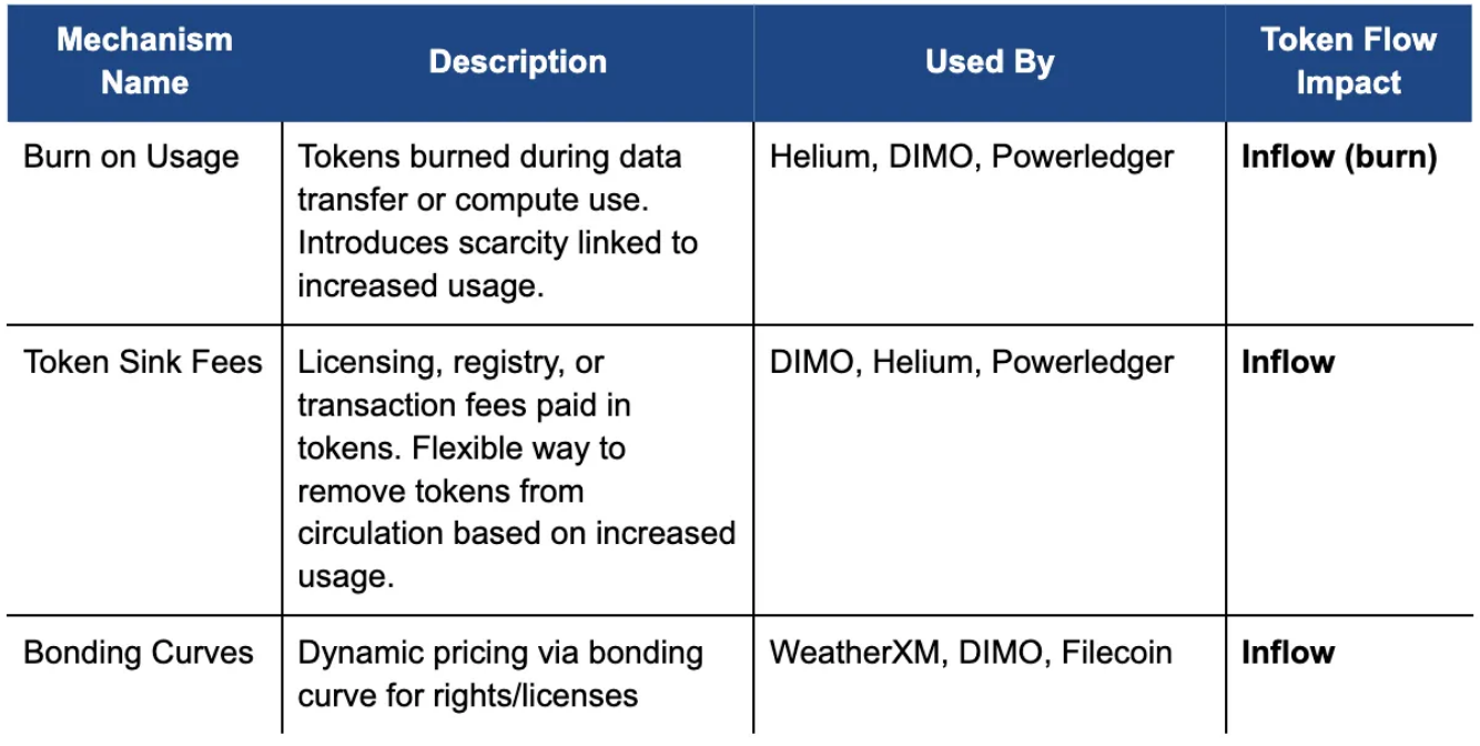Of course, no two DePIN protocols are exactly alike. Token design choices should reflect the unique needs of the network — its cost structure, user behavior, and growth trajectory. The tables below outlines a wide range of token mechanisms used across DePIN protocols today, from baseline issuance and bonding curves to staking, slashing, and fee sinks. Each mechanism plays a role in shaping token utility, velocity, and long-term value.